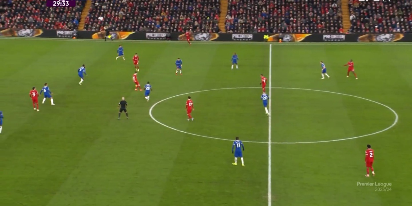 고메즈가 좌측 하프에 위치하며 좌측으로 몰아넣은 첼시 선수들과의 좌측 볼 경합에서 수적으로 밀리지 않도록 하였다.